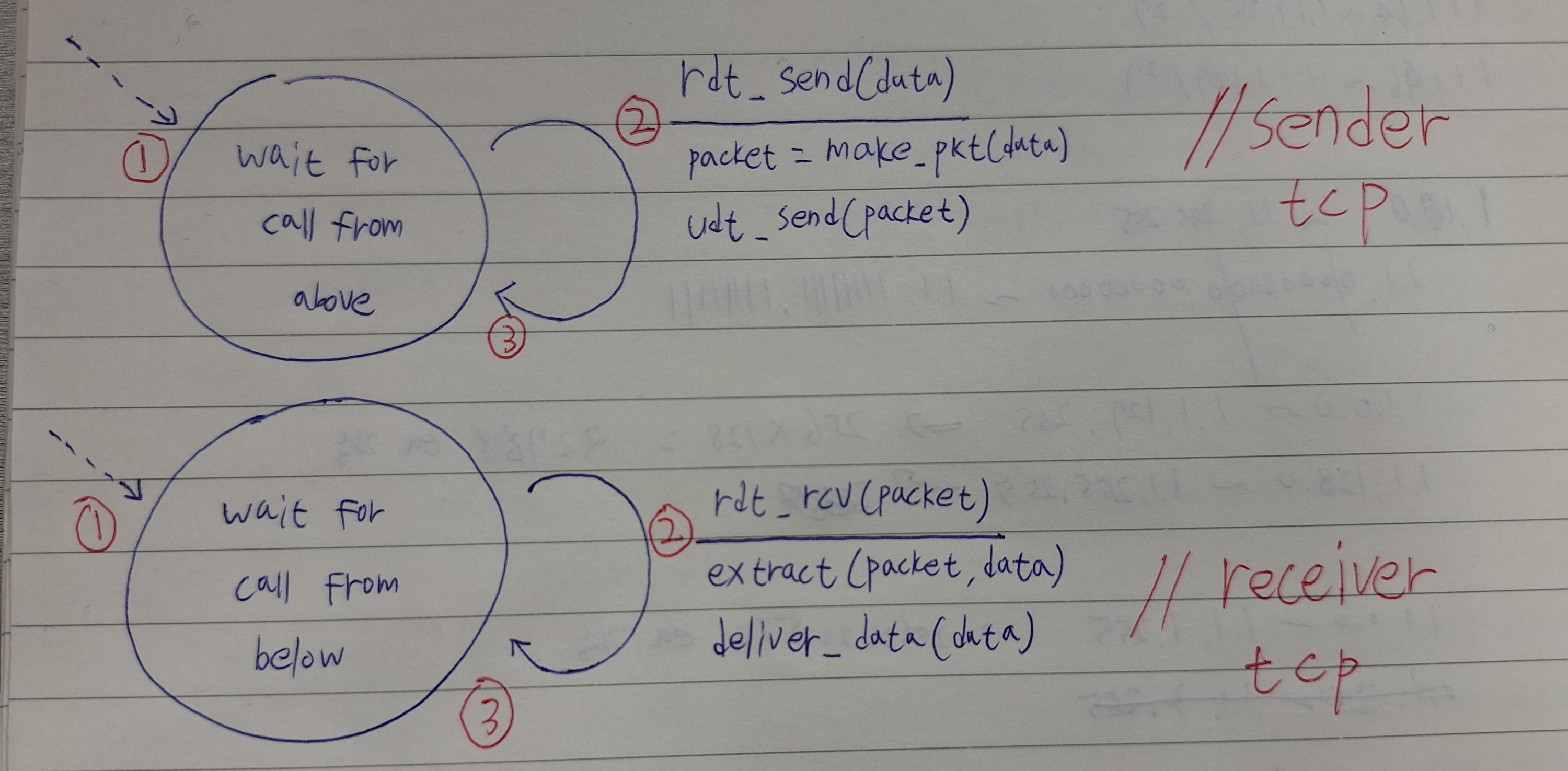 rdt_send() : 응용 계층이 하위 rdt에 데이터를 전달하기 위해 취한 액션이다. rdt 입장에서는 이벤트가 발생한 것이다.