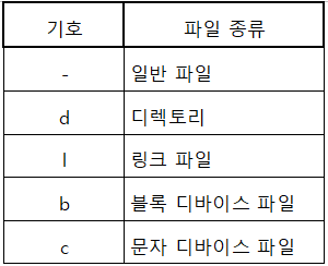 퍼미션 부분에서 첫 번째 자리는 파일의 종류를 나타낸다. 진짜 퍼미션은 첫 자리를 제외한 9자리가 나타낸다.