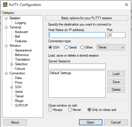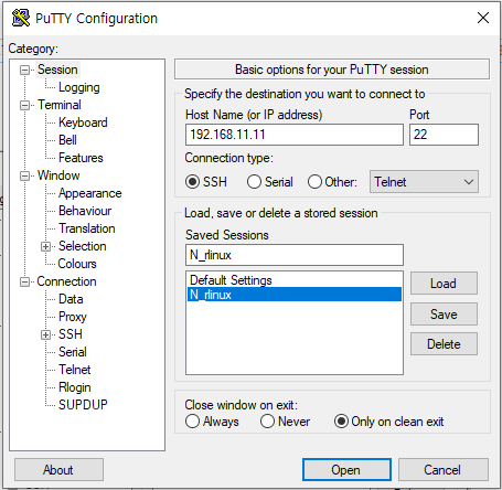 Saved Sessions 바로 밑 빈칸에 만들고 싶은 세션의 이름을 적고 위의 Host Name (or IP address)부분에 리눅스에서 설정한 IP 주소를 입력하고 save.