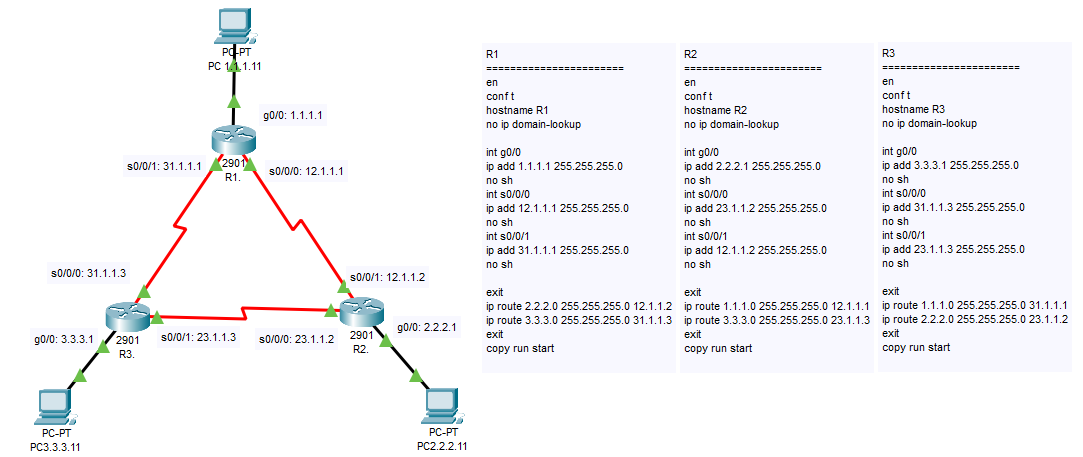 라우터의 인터페이스마다 ip설정만 해놓은 경우, R1은 1.1.1.0/24와 12.1.1.0/24 네트워크에 연결되어있으므로 2.2.2.0/24 네트워크에 대한 정보는 없다. 때문에 반드시 위와 같이