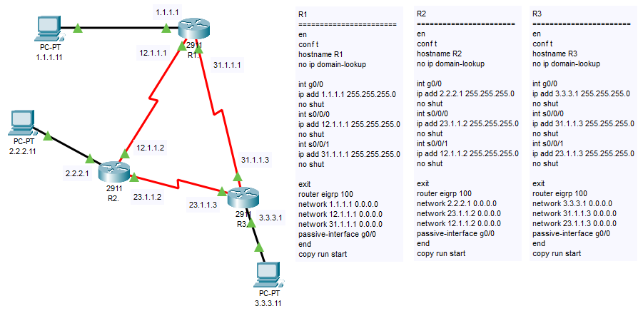 show ip protocols, show ip eigrp neighbor, show ip eigrp topology 등의 명령어로 설정 상태를 확인할 수 있다.