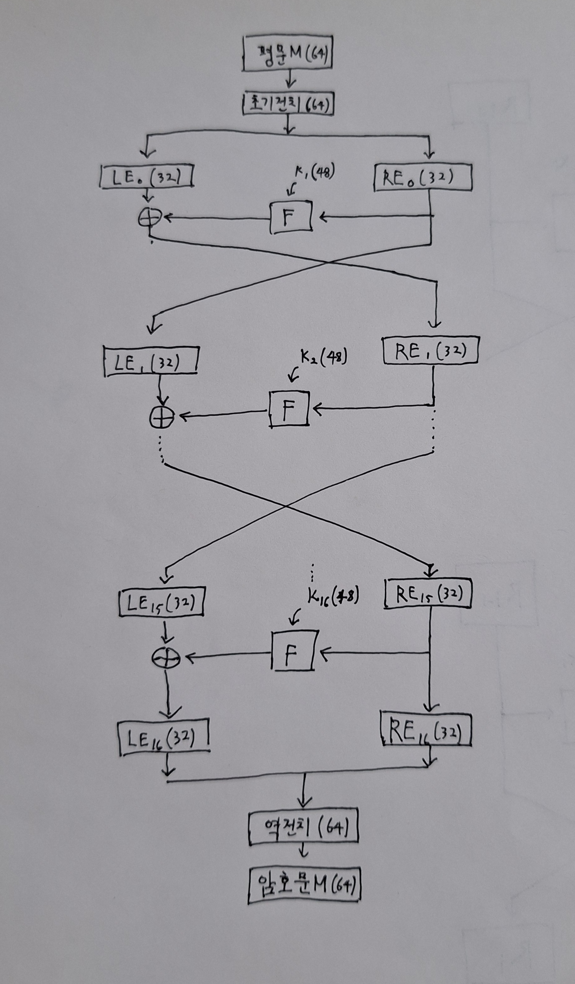 - 기본적인 구조로 round 수는 16 round이며, 복호화는 암호화의 역순이다.