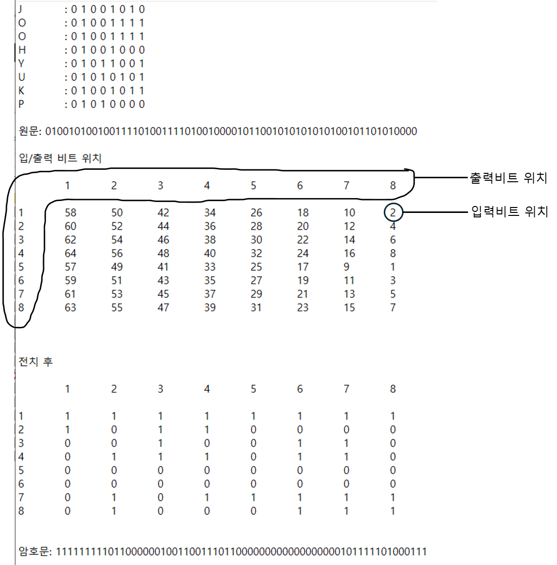 초기 전치 방법은 원문의 비트수에 맞게 출력비트 위치와 입력비트 위치를 나타내는 숫자표를 만들고, 입력 비트 위치에 해당하는 값을 대입하여 암호문을 생성한다.