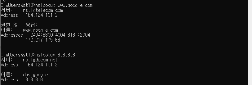 nslookup 명령어는 어떤 도메인 네임에 대한 ip 주소를 알려주는 명령어로, 이때 DNS 서버에게 질의를 하는 것으로 해당 주소를 클라이언트에게 출력해준다.