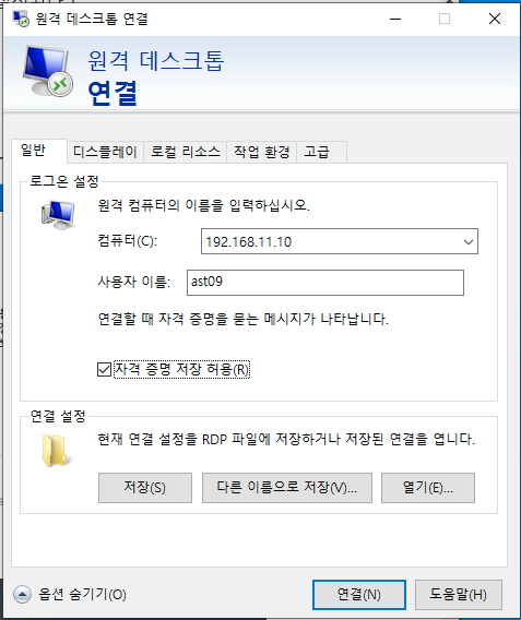 접속하려는 가상 윈도우의 ip 주소와 계정을 입력하고 저장하면 해당 파일을 통해 원격 접속이 가능하다.