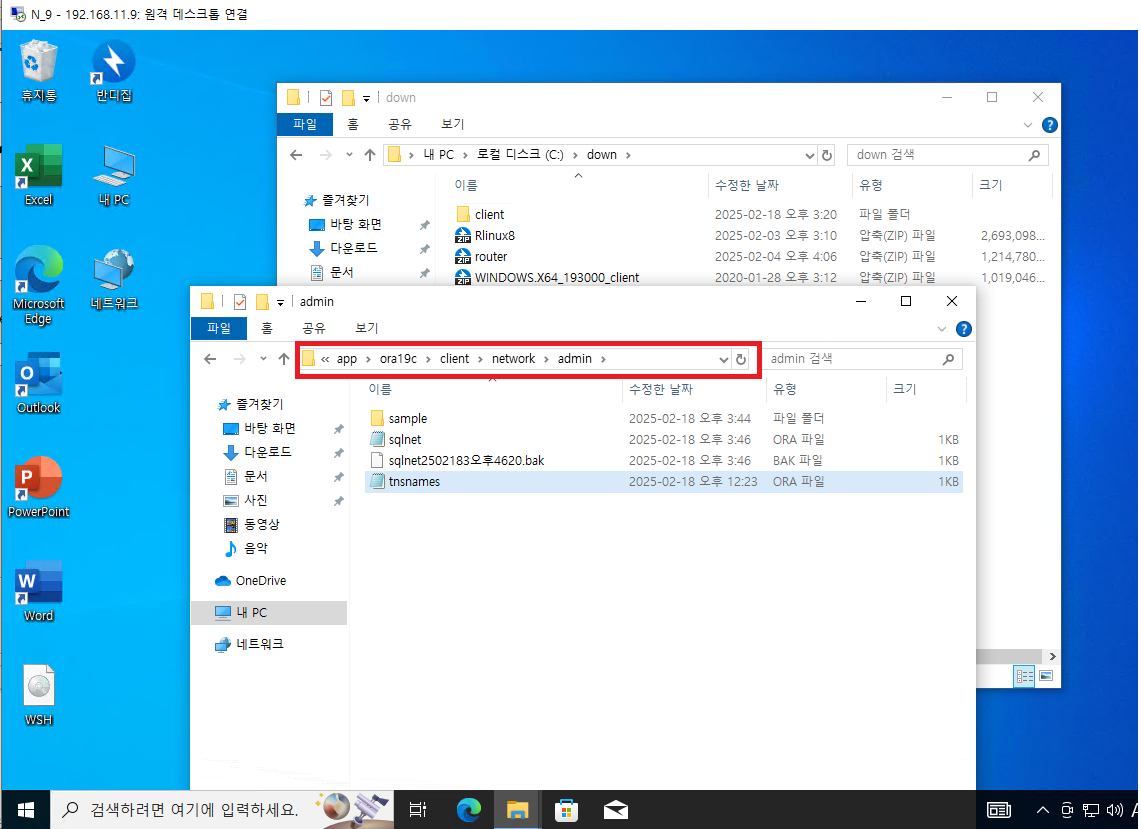 tnsnames.ora 파일을 오라클 파일 저장 위치에서 client - network - admin 위치에 저장한다.