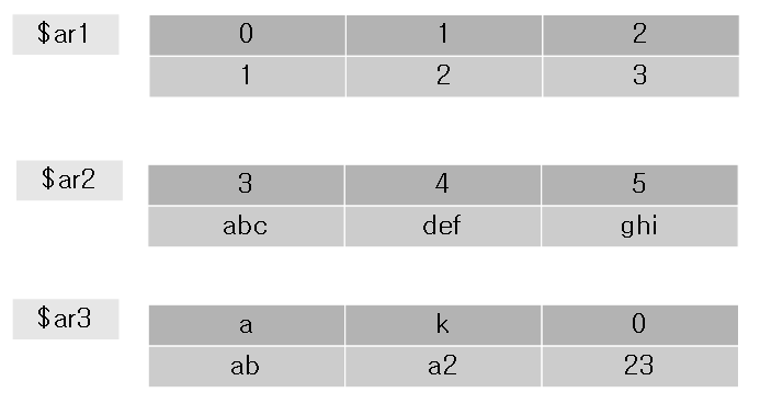 위의 array()는 배열을 생성하는 함수이다. 배열의 키값은 지정할 수도, 안 할 수도 있다. 생성된 $ar1, $ar2, $ar3의 구조는 다음과 같다.