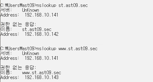 ① 기존 ast09.sec.zone 파일에 다음과 같이 하위 도메인에 대한 정보를 추가한다.
