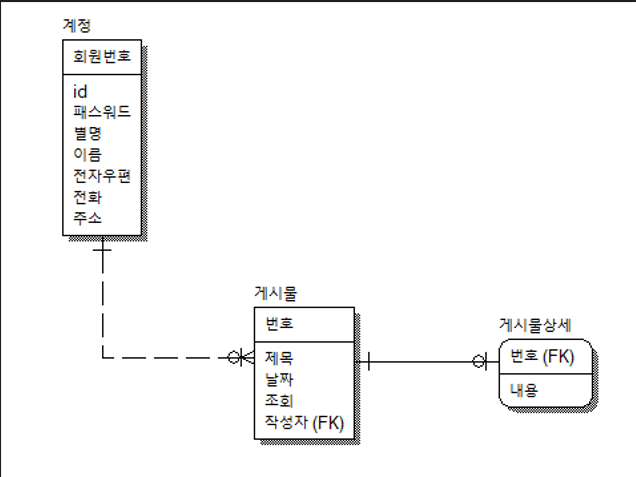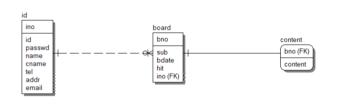 하나의 게시물에 내용 부분이 비어있을 수 없고 반드시 하나 있어야 하므로 board와 content 테이블은 1대1 관계로 수정한다.