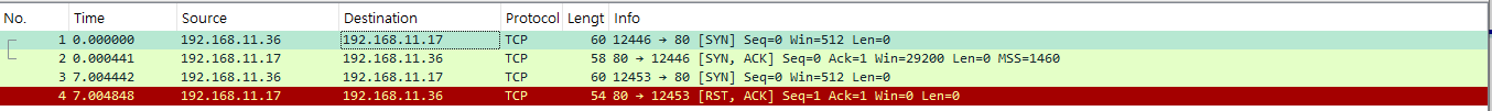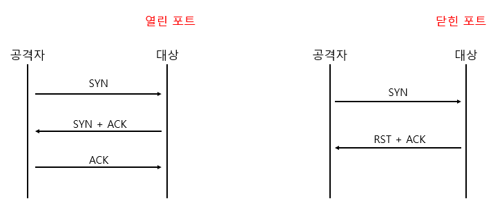포트가 열려있을 경우 세션이 성립되며, 포트가 닫혀 있을 경우에는 RST+ACK 패킷을 받게 된다.