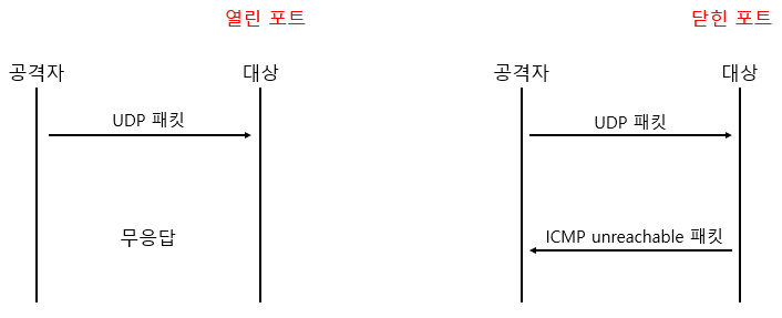 UDP는 3W HS를 하지않으므로 열린 포트의 경우 응답이 없지만 닫힌 경우 ICMP unreachable 패킷을 반송한다.