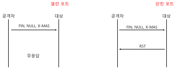 열린 포트에 FIN 패킷을 보내면 응답하지 않지만(응답할 것이 없다.) 닫힌 포트는 RST 패킷을 응답한다.