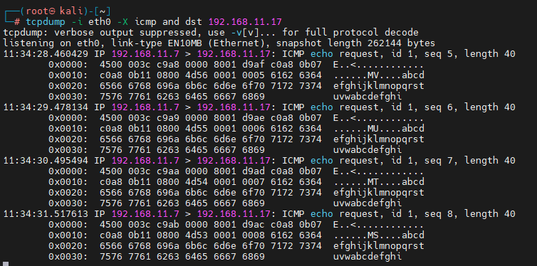tcpdump -i eth0 -X icmp and dst 192.168.11.17 > aa.pkt