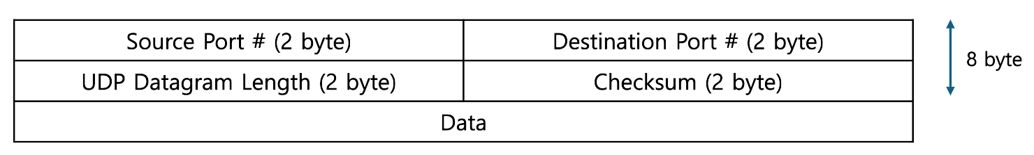 - UDP Datagram Length : 헤더와 데이터를 합한 사용자 데이터그램의 전체 길이로 0~65535의 범위를 갖는다.
