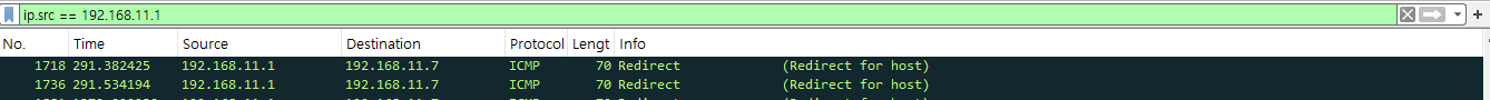 이때 이 ICMP 리다이렉트 패킷은 다음과 같이 192.168.11.1이 보내는 것으로 인식한다.
