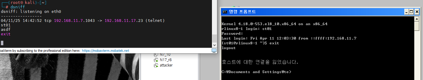 192.168.11.7(클라이언트)에서 192.168.11.17(Telnet)서버로 접속 후 빠져나오면 위와 같이 접속했던 계정의 id와 passwd를 공격자 측 화면에 출력한다.