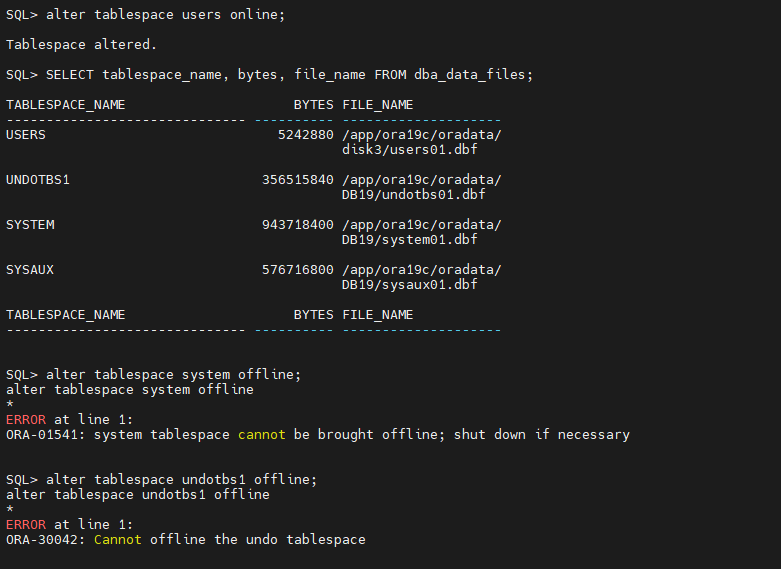 - 오프라인된 테이블 스페이스는 더 이상 접근이 불가능하다.