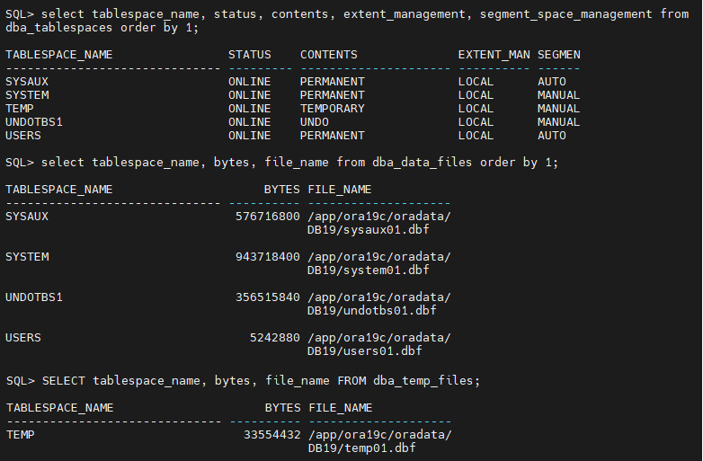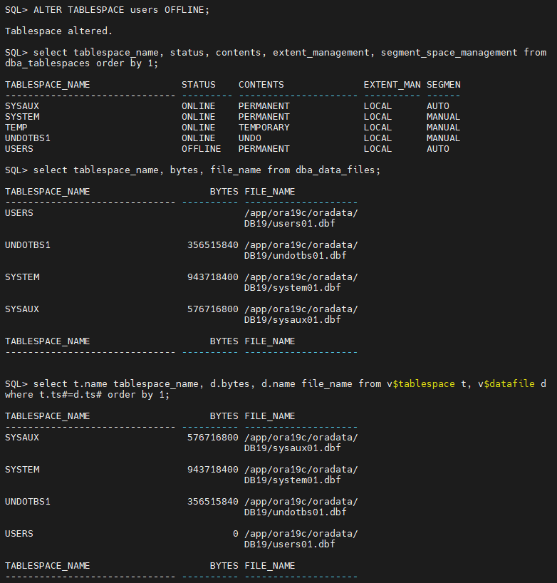 - 오프라인이 된 테이블 스페이스는 데이터 파일의 크기가 공백 혹은 0으로 표시된다.