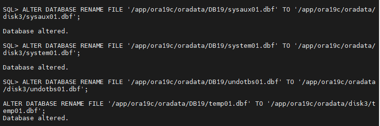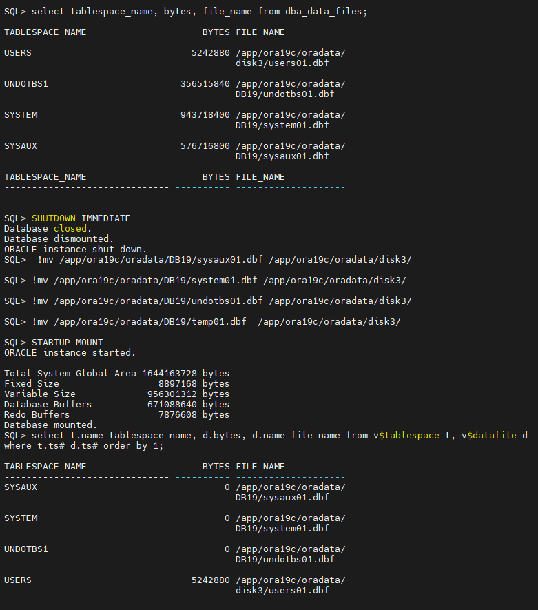 오프라인 변경이 되지않는 데이터 파일을 이동시키기 위해서는 다음과 같이 DB를 셧다운 한 상태에서 작업을 진행한다. 해당 작업 방식은 모든 테이블 스페이스에 적용 가능하다.