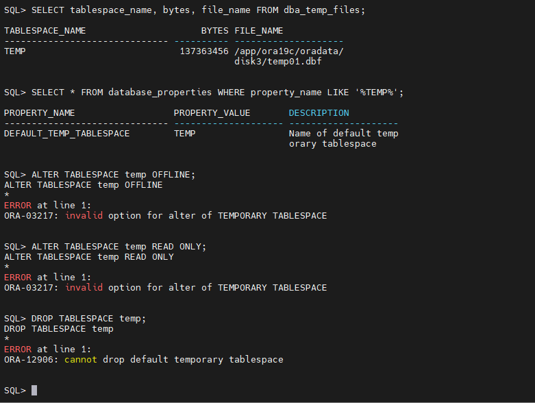 - 일반 템포러리 테이블 스페이스는 아무 제약 없이 삭제가 가능하나, 디폴트 템포러리 테이블 스페이스는 삭제가 불가능하다.
