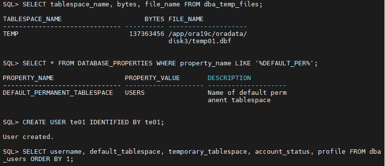 - 새로 생성된 사용자를 포함하여 유저 레벨에서 디폴트 테이블 스페이스가 지정되지 않은 모든 유저의 디폴트 테이블 스페이스가 변경된다.