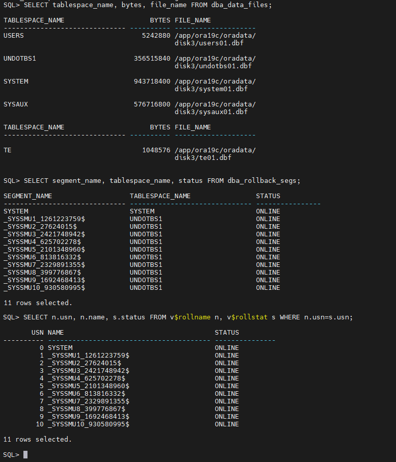 SQL> SELECT SEGMENT_NAME, TABLESPACE_NAME, STATUS