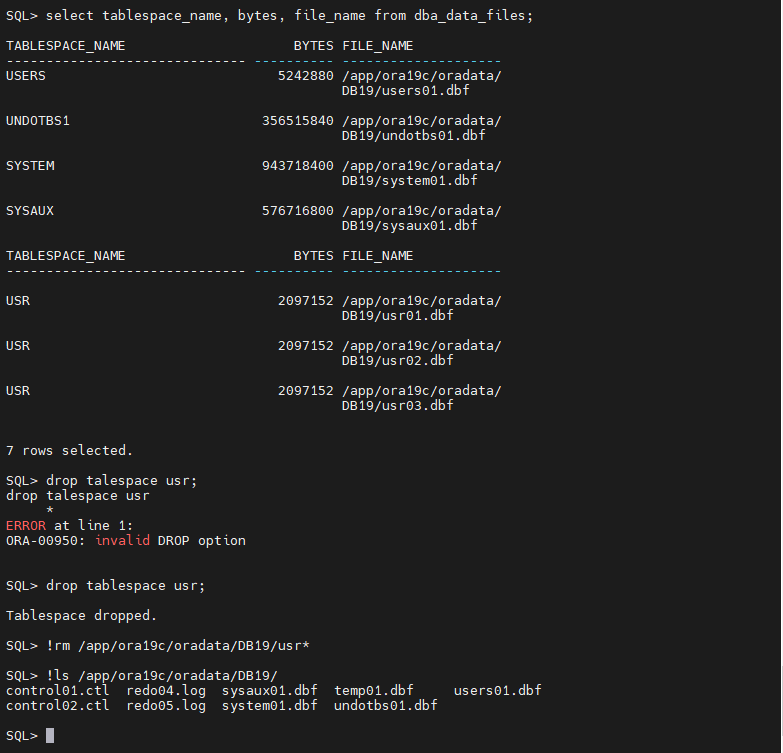 - AND DATAFILES : 테이블 스페이스에 포함된 데이터 파일을 같이 지운다. 이 옵션을 쓰지 않으면 데이터 파일은 OS상에서 직접 지워야한다.