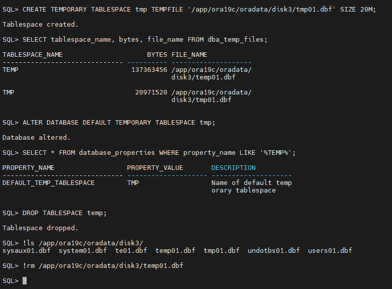 - tmp 템포러리 테이블 스페이스 생성 후 이를 디폴트 템포러리 테이블 스페이스로 변경한다.