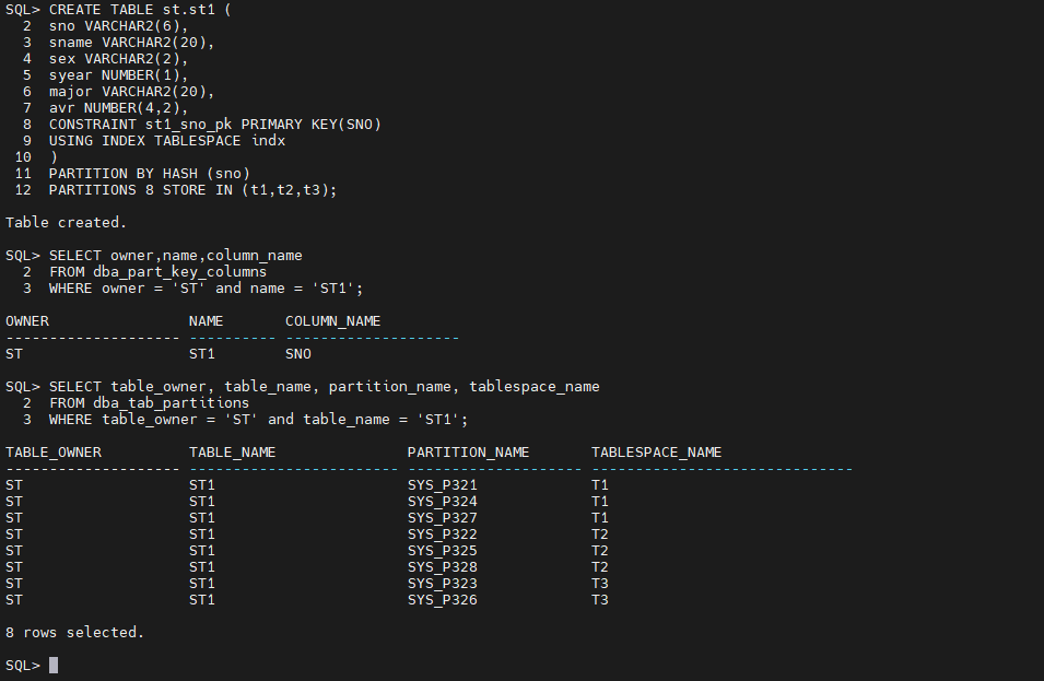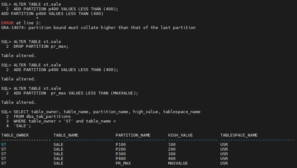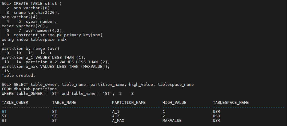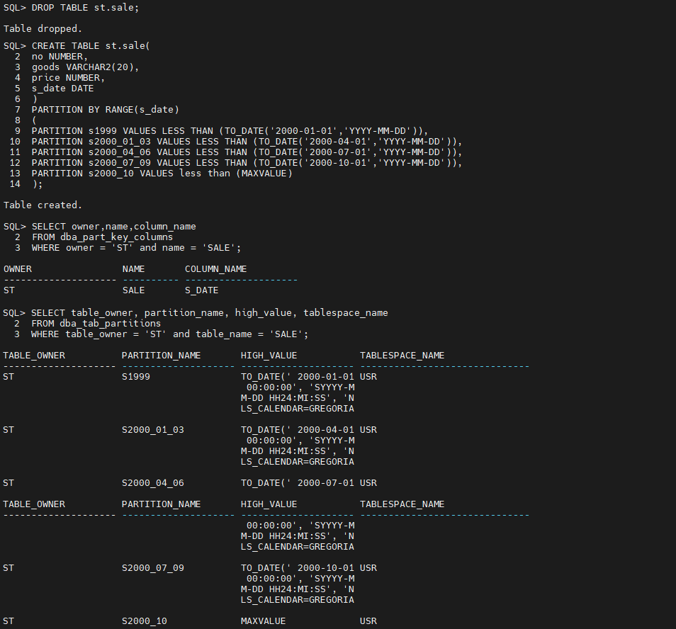 SQL> SELECT TABLE_OWNER, TABLE_NAME, PARTITION_NAME, HIGH_VALUE, TABLESPACE_NAME