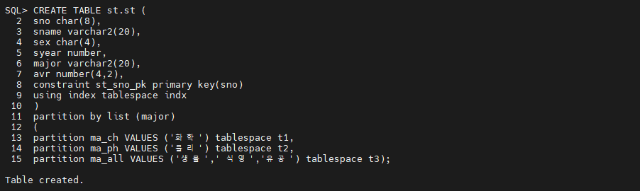 - STORE IN : 파티션이 저장될 테이블스페이스 리스트