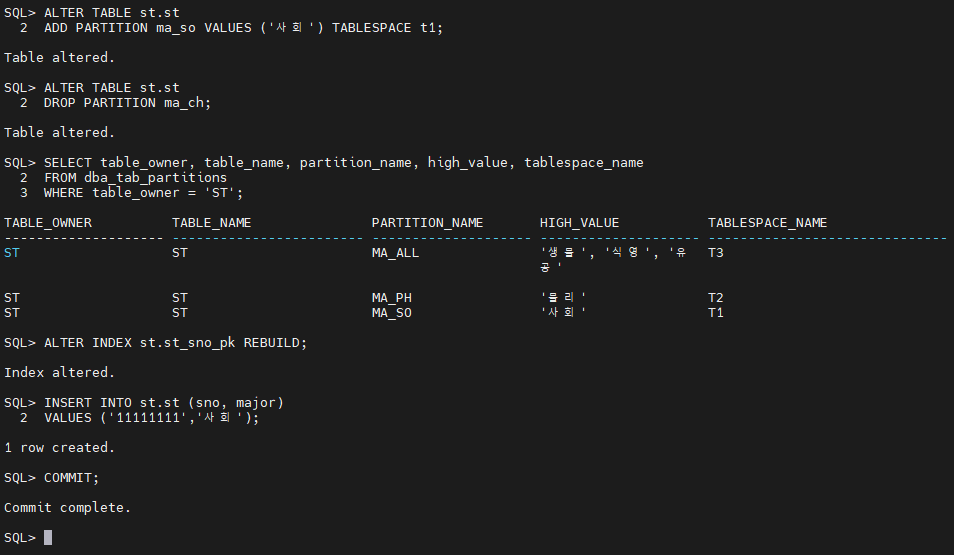 PARTITION <partition명> VALUES (<column값>) [ TABLESPACE <tablespace 명> ],