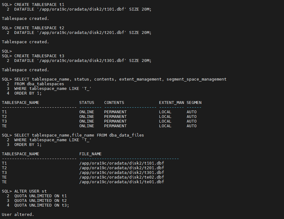 - st 유저에게 새로 생성한 테이블스페이스에 대해 쿼타를 할당한다.
