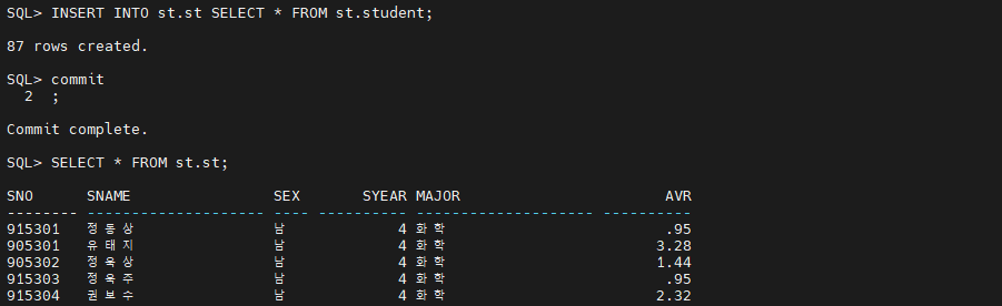 - st.st 테이블에 st.student 테이블의 데이터가 인서트된 것을 확인한다.