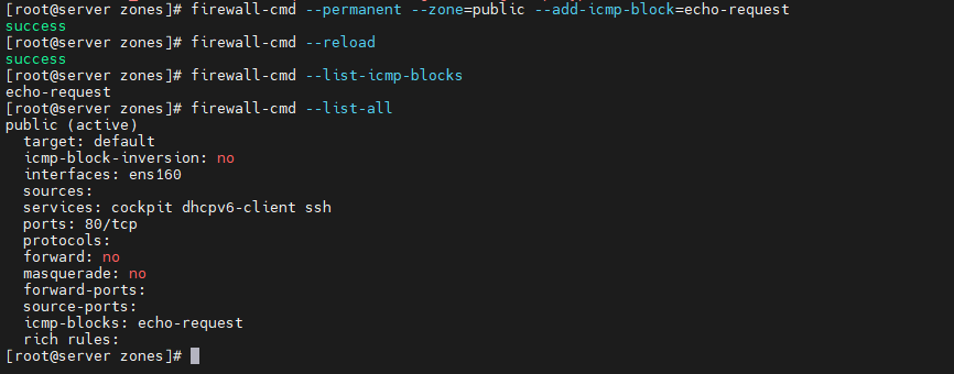 # firewall-cmd --permanent --zone=zone --add-icmp-block=<icmp type>