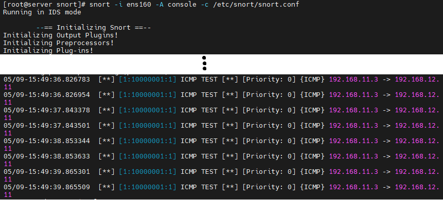 # snort -i ens160 -A console -c /etc/snort/snort.conf