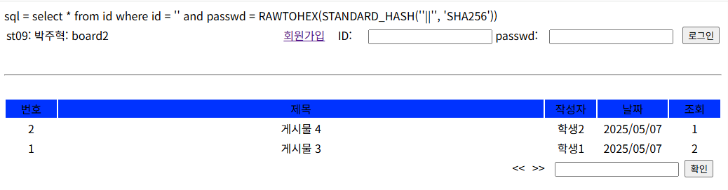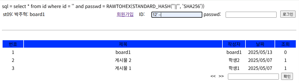 $sql= select * from id where id = '12' --' and passwd = RAWTOHEX(STANDARD_HASH('$userpasswd'||'$id', 'SHA256'));