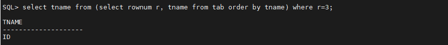 select tname from (select rownum r, tname from tab order by tname) where r=3;