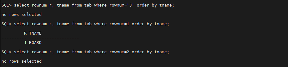- rownum은 출력할 때 정해지므로 조건 검색은 1까지만 가능하다.