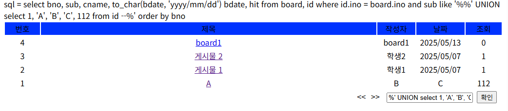 ③ 검색창에 다음과 같은 문장을 입력하여 공격자가 원하는 컬럼의 값을 게시판에 출력한다.