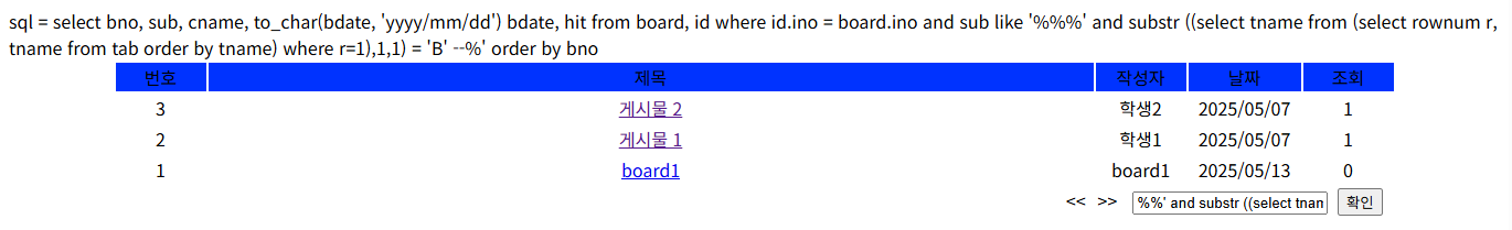 - 첫 번째 sql 문은 첫 테이블의 첫 번째 글자부터 한 글자를 출력한다. 즉 첫 테이블의 첫 글자를 알아낸다.