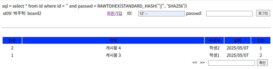 - id' --와 id' or 1='1' -- 공격 모두 유효한 것을 확인할 수 있다.